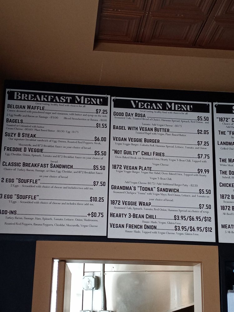 Customers rave about the homey atmosphere, generous portions, and mouthwatering dishes like the shrimp and grits, Suzy B breakfast pizza, and Freddie D Veggie breakfast sandwich. The 1872 veggie wrap is a popular choice, with tofu, hummus, and fresh vegetables.
